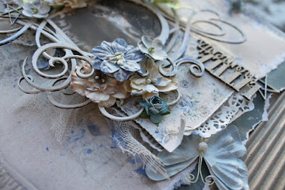 I have painted the frame and the scrolls from Scroll set #1 (DA1466) with white gesso and then with Colour Paste from Colour Blast (Just Blue). I added some water to the paste and then used a small brush to paint on both chippies and paper. Amazing colour!! You can find Colour Blasts products at the Dusty Attic website!
